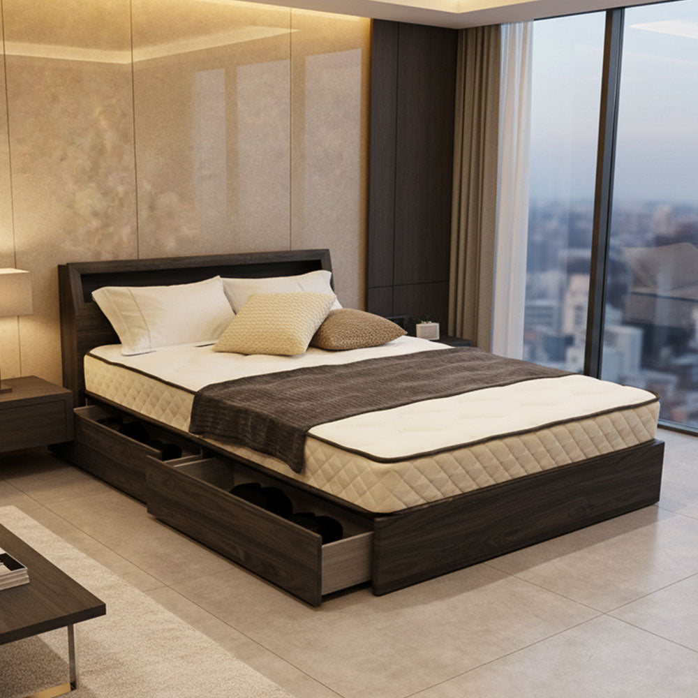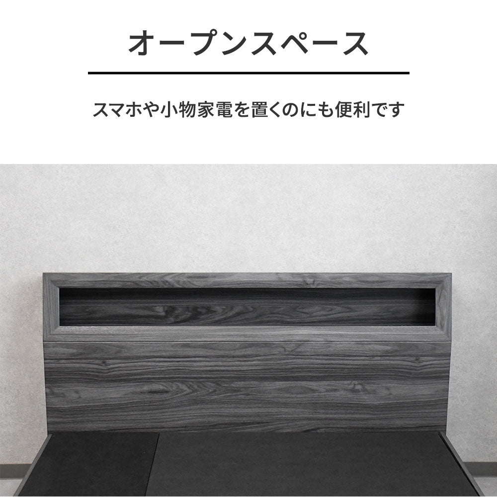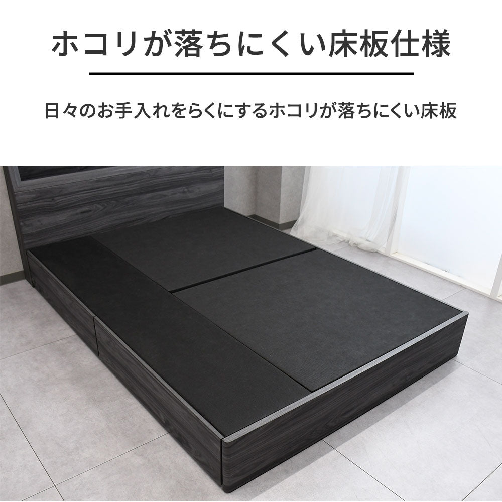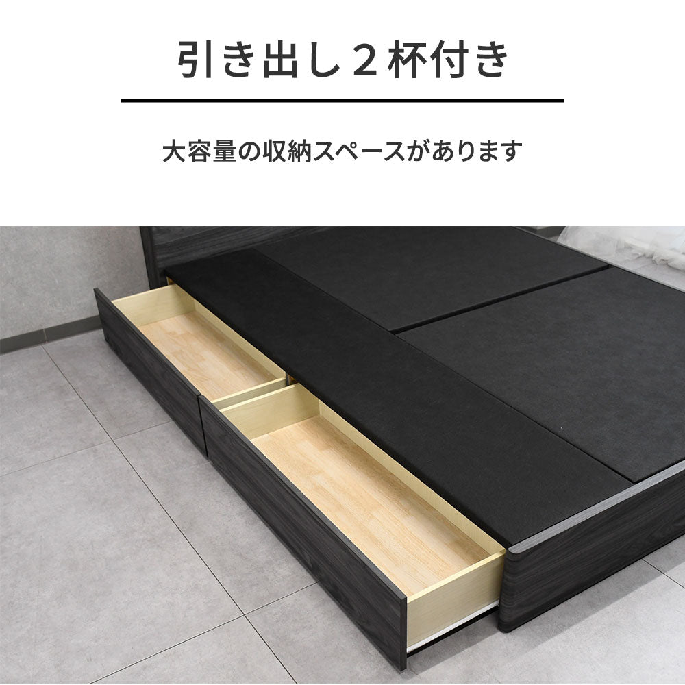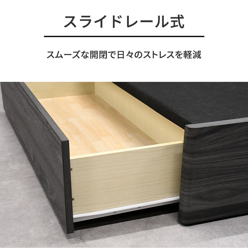フレーム下には大容量の引き出し収納を備え、衣類や寝具、小物の整理に便利です。